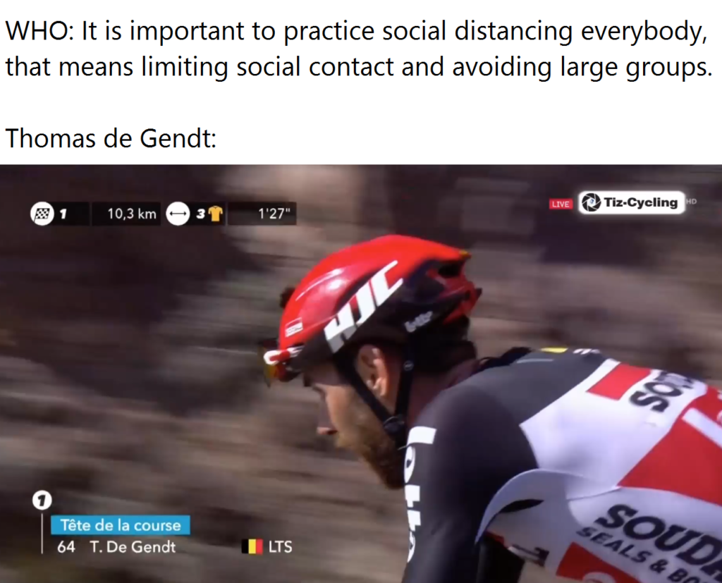 March 14, 2020. “Thomas ‘Solo’ de Gendt, the Incontagiable“ An excellent early Covid-19 crossover meme. Thomas de Gendt loves a solo breakaway, so social distancing is easy for him. Wow, it’s not funny when you explain it, huh. Visit the main Advent Calendar page