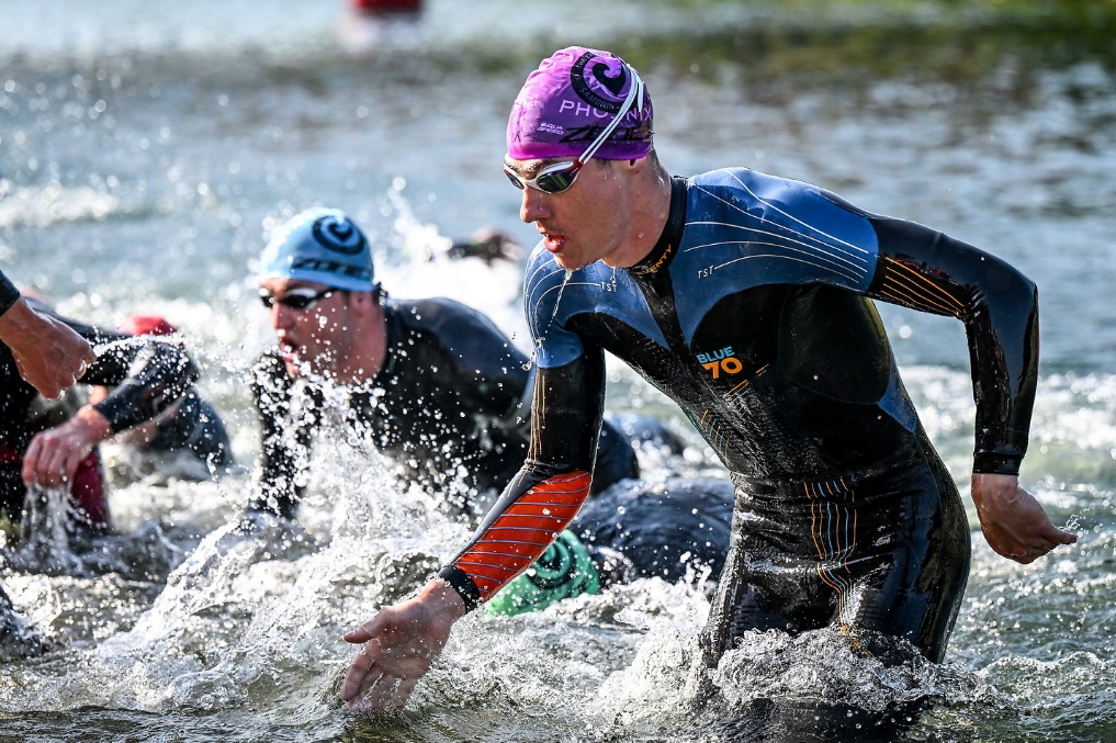 The men’s swim provided no clear leader with 18 men exiting the water within 20 seconds of each other, led by Rico Bogen (GER) and Mark Dubrick (USA) neck-and-neck in 22:21. With all leaving T1 within 30 seconds of each other, the Challenge Family 20m rule ensured fair racing on this fast, flat course. There followed two hours of fierce racing between some of the sport’s strongest cyclists as the lead constantly changed before Kristian Høgenhaug (DEN) made the move and put distance between himself and the chasers. However, Frederic Funk (GER) was having none of it, pushing hard at speeds of up to 60kph to take the lead and come into T2 nearly two minutes clear with a split of 1:48:48, breaking his own bike course record from 2023.