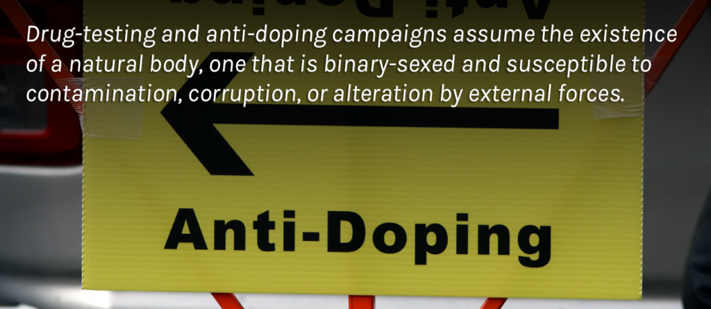 The history of drug testing in sports is specifically a history of regulating physical bodies. While drug testing and gender testing may seem relatively disparate processes to sports fans in 2017, for much of sporting history they have served the same purpose (Wackwitz 2003; Ritchie 2003), especially overlapping in testing women for the masculinizing effects of androgens. Davis and Delano (1992) discuss how the “natural” body becomes entwined with binary conceptions of physical sex in anti-steroid advertising campaigns, relying on the imagery of rigid and desirable gender norms, and protecting the sexed body from contaminations that distort it from its naturalized state. This is an explicitly regulatory process with the effect of defining and regulating “natural” bodies along gender segregated lines (Wackwitz 2003; Ritchie 2003). It is built on the privileging of a view of nature that reflects societal gender norms, and its phrasing of the deviation from these norms as a negative consequence serves to regulate gender norms and the performativity of the physically sexed body no less than it renders drug use undesirable. Drug-testing and anti-doping campaigns assume the existence of a natural body, one that is binary-sexed and susceptible to contamination, corruption, or alteration by external forces. Similarly, gender segregation in sports is predicated on two factors. The first is that there exists a natural body. It is assumed that there is a given state for bodies—particularly in the sense that there are two rigid, distinct sexes into which all bodies can be categorized—and that this state is broadly in line with existing social expectations of bodily comportment. The second factor follows on from the first as an implied masculine athletic superiority, or at least, an assumption that the two categories of bodies are naturally suited to different physical tasks. (Brookes 2002, pp. 123-127; Messner & Sabo 1990, p. 9).