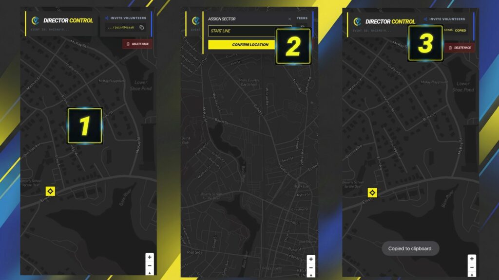 Hitting Start New Race takes you to the Director Control map view, where you add pins for all the locations that will have volunteers on event day.