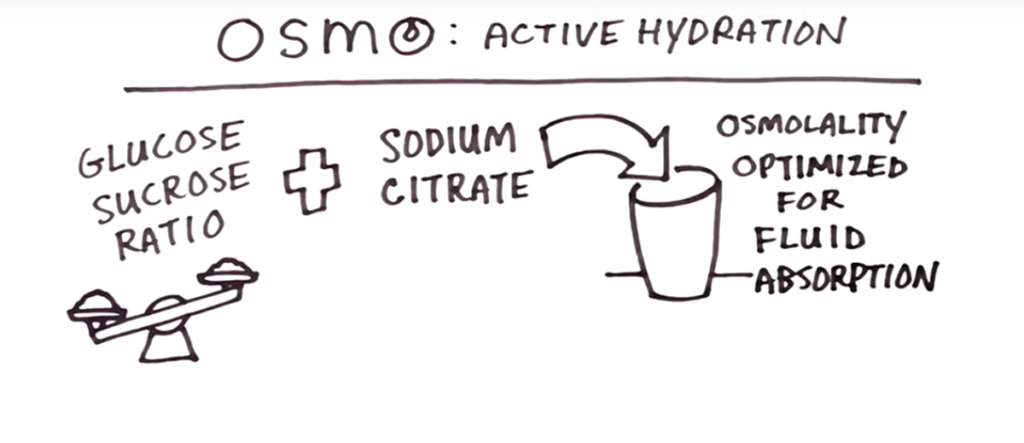 In sports drinks, osmolality is determined by the carbohydrates, amino acids, and proteins when they’re diluted in your bidon. To optimize intestinal fluid exchange, you make the concentration of the drink lower than that of your bloodstream. That’s Osmo’s big selling point. Here’s a cute drawing of how it works:
