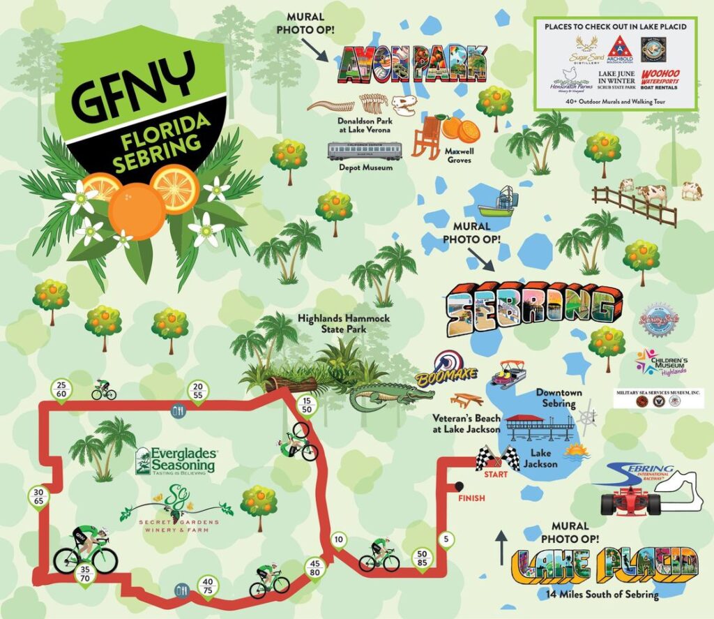 “Sebring is quickly becoming a hot spot for cycling and now also running due to the two races we hold here in October,’ says GFNY co-founder Lidia Fluhme. “Florida is a tough spot to hold races due to the lack of low traffic roads. But Sebring is conveniently located between Miami, Tampa and Orlando and has some of the very best cycling in the state. Highlands County has been amazing to work with to close or moderate roads in order to give the 800 racers a safe and exciting experience.”