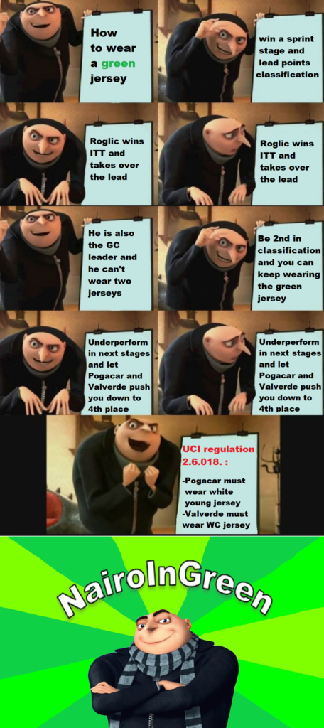 September 10, 2019. “Greatest sprinter r/NairoInGreen” This one kind of has the same energy as those terrible Trumpeached t-shirts. It’s the story of how Nairo Quintana could remain in the green jersey through a series of convoluted circumstances.