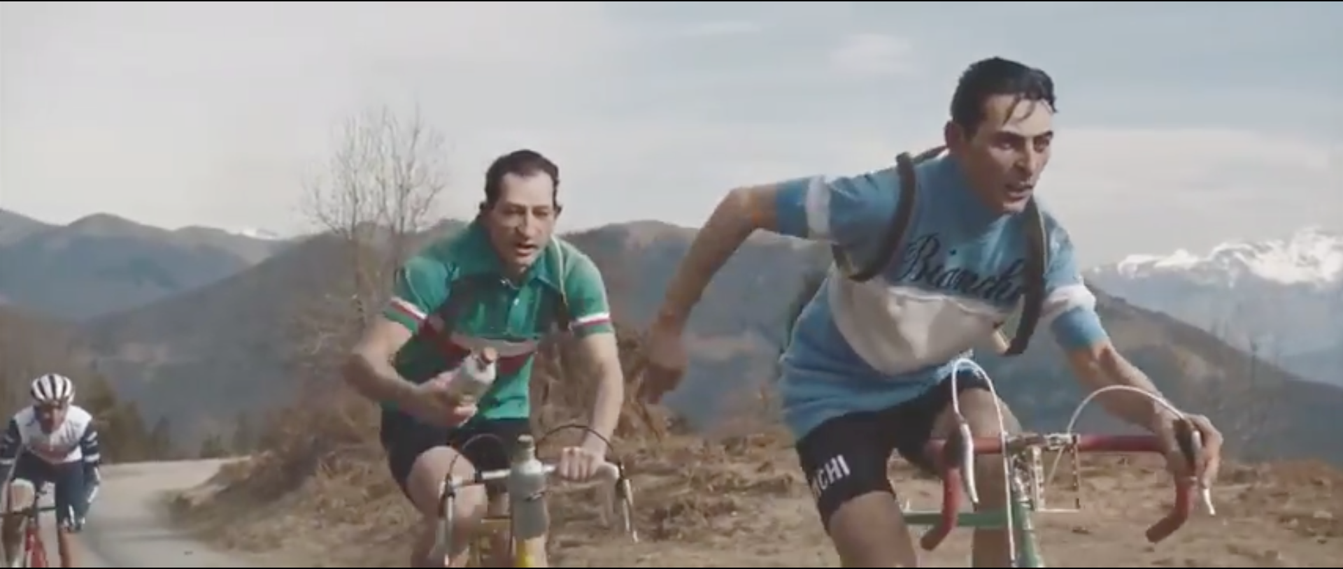 After leaving the possibly magical forest, he encounters Fausto Coppi handing Gino Bartali a water bottle.