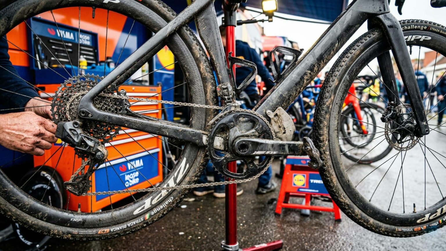In a desperate attempt to stop chains from violently bouncing off the chainrings on the Koppenberg, teams like Visma | Lease a Bike and Lidl-Trek are ditching their front derailleurs entirely. They are opting for massive, single 54-tooth front chainrings paired with enormous rear cassettes. They are essentially running cyclocross setups, except they are trying to push 50 km/h on flat, windy highways before they hit the dirt.