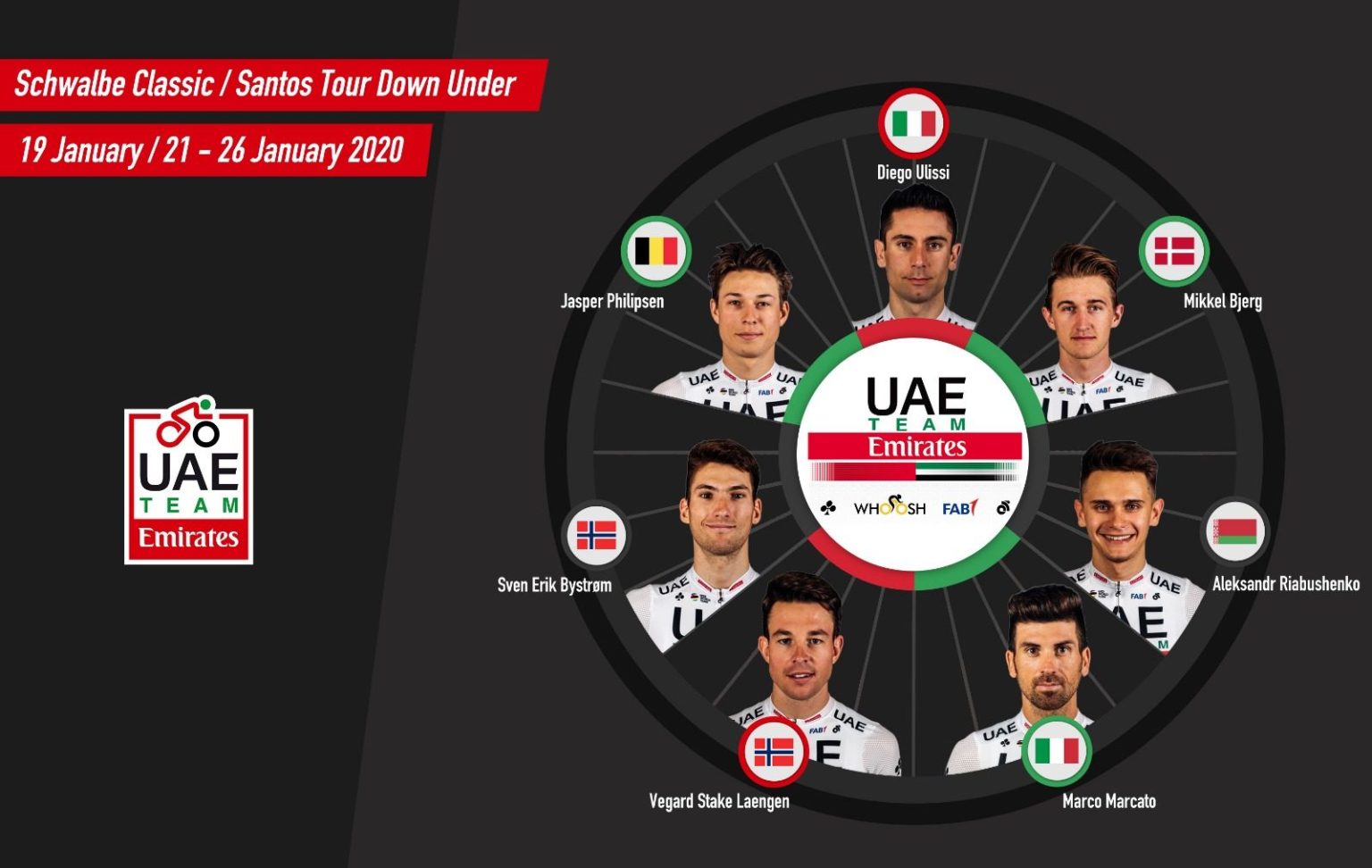 “UAE Team Emirates is really looking forward to the start of the season at the Tour Down Under in Australia. We come with multiple objectives having Diego Ulissi for the hilly stage finishes and GC and stage winner from last year Jasper Philipsen for the sprint stages. We have a great support team with Bjerg, Bystrøm, Laengen, Marcato and Riabushenko”.