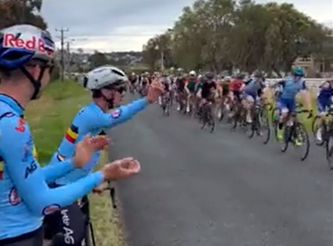 Wout van Aert and his Belgian team mates took a break from their training ride in Australia ahead of the Worlds to cheer on a local bike race. It’s his BIRTHDAY, and this is what he chooses to do. Same, Wout. Here’s the video.