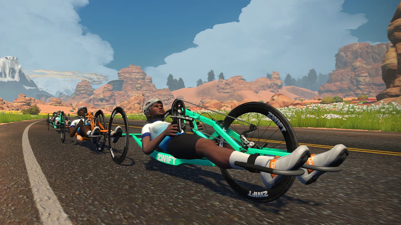 Handcycles are distinguished from upright bikes by a three-wheeled design that puts the rider much closer to the ground. As the name implies, a handcycle is propelled by a cyclist cranking with their arms, instead of pedaling. Like other bikes in Zwift, the handcycle is designed to evoke its real-life inspiration, placing riders in a reclined position with their legs facing forward. The Zwift Handcycle bike is branded “Zwift,” like some other in-game models, and Zwifters will be able to choose the color of theirs. It has unique aerodynamic characteristics, receiving some draft from upright bikes in the game, while not conferring a draft onto upright bikes. Handcycles can draft each other.